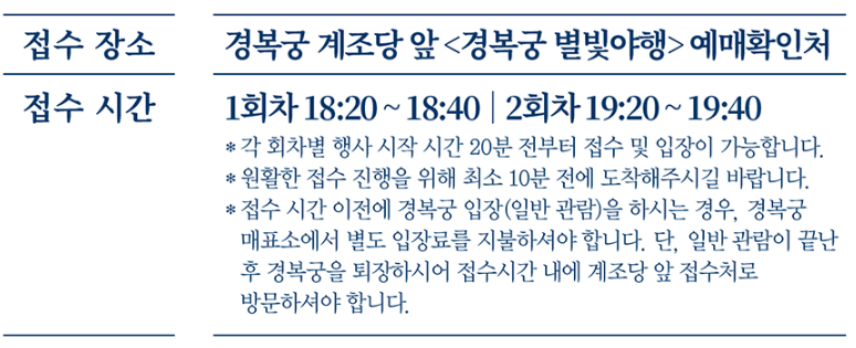 경복궁 야간개장 티켓은 티켓링크를 통해 응모하며, 당첨자만 선예매(최대 2매) 할 수 있어요.